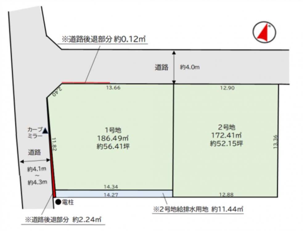 1号地:2150万円 186.49㎡(56.41坪) 2号地:1850万円 172.41㎡(52.15坪)