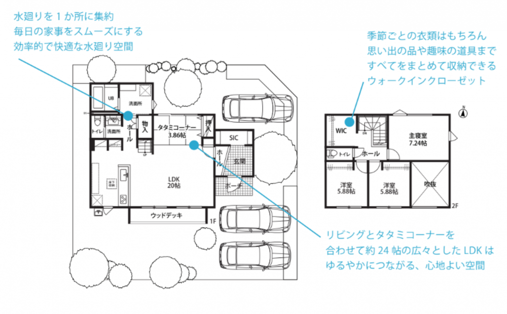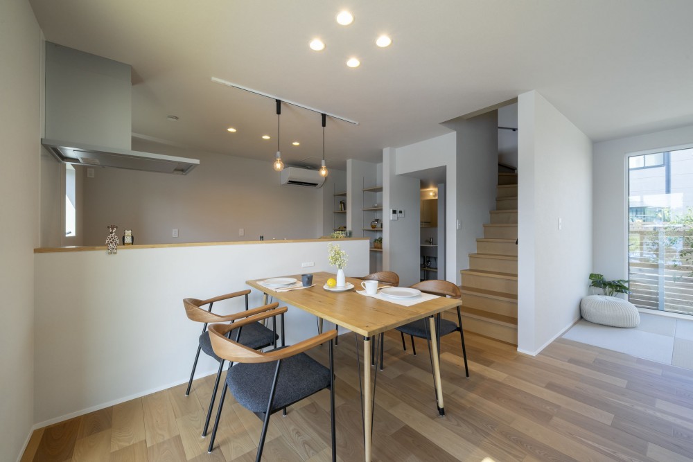 約24帖の広々としたLDKはリビングとタタミコーナーが一つになり家族みんながゆったりとくつろげる大空間です。