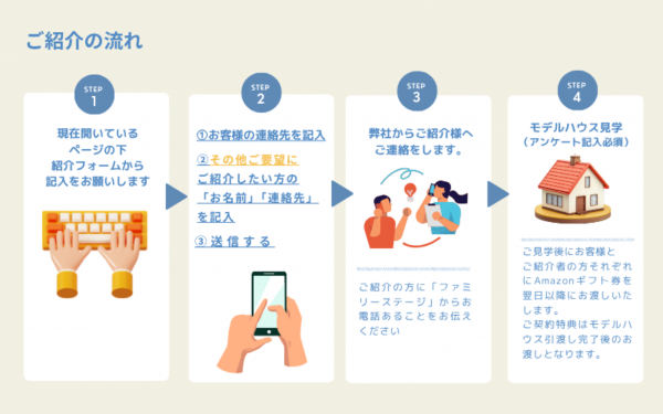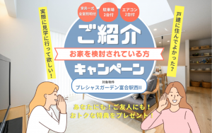 ⚠️ ご案内・注意事項特典は後日、ご本人様への「直接手渡し」となります(オンラインでのお渡しは不可)。ご紹介された方が過去に弊社をご利用されている場合は対象外となります。ご来場時のアンケート記入が必須となります。オンライン相談はキャンペーン対象外です。