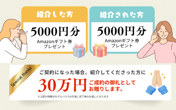 ご紹介いただいた方がご成約となった場合、紹介者様へ**「ご成約御礼」として【30万円】**を贈呈いたします。※モデルハウスお引渡し完了後のお渡しとなります。